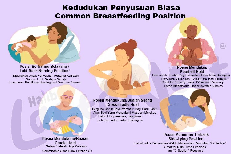 Posisi yang Selesa: Pastikan anda duduk atau berbaring dalam posisi yang menyokong badan. Gunakan bantal menyusu jika perlu untuk menyokong bayi.